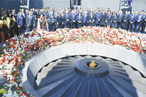 4月24日,在亚美尼亚埃里温,亚美尼亚官员和各界民众向“大屠杀”纪念碑献花。
