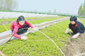 5月2日,沈丘县范营乡菜庄行政村的留守妇女正在管理新培育的辣椒苗。沈丘县积极鼓励、引导各类新型农业主体聘用农村留守妇女,尤其是贫困家庭的留守妇女就近就业,有效解决了留守妇女就业增收问题。 肖飞 摄
