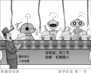 工信部官网显示:浙江率先推进机器换人,计划自2013年起5年间,每年实施5000个机器换人项目,实现5000亿元机器换人投资;安徽正抓紧推进“‘机器换人’十百千工程”;广东、山东等地则都在自身具备比较优势的产业领域大力推动“机器换人”,已有不少人工岗位被机器人劳动力替代。新华社发 曹一 作
