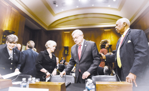 5月2日,在美国首都华盛顿国会山,美国艾奥瓦州州长特里·布兰斯塔德(前右二)准备出席在国会参议院举行的美驻华大使提名人听证会。