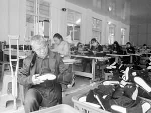 近日,沈丘县卞路口乡高山店村一家鞋厂里,留守妇女正在忙着加工布鞋,残障人士马增喜在给布鞋剪线头。在脱贫攻坚工作中,沈丘县优化投资环境,吸引县内外企业前来投资,在村里建成74个“扶贫车间”,使留守妇女、残障人士在家门口实现就业增收。黄海涛 摄
