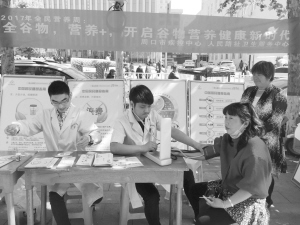 5月16日,周口市疾控中心医护人员走上街头,开展健康饮食宣传,普及合理膳食知识。图为该中心医护人员正在为市民免费测量血压。