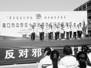 近日,为引导青少年自觉践行社会主义核心价值观,由共青团周口市委、周口市防范办、周口报业传媒集团联合主办,共青团川汇区委、川汇区教体局、周口市二十三中承办的 “周口市中学生十四岁集体生日庆祝仪式”在二十三中举行,该校1000多名师生参加了活动。学生们通过重温入团誓词、新团员入团仪式、合唱《四德歌》等形式表达了即将告别童年、踏入青少年的成长喜悦。 记者 朱鸿 摄