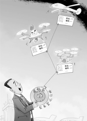 如今,无人机在拍摄、监测、农业生产等多个领域已得到广泛应用,但与此同时,无人机“黑飞”事件也频频出现。“黑飞”不仅严重干扰了航空秩序,还容易造成个人隐私泄露。为强化监管,民航局日前宣布,6月1日起民用无人机将实行实名登记注册。这正是: