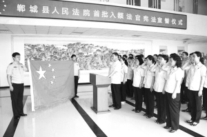 本报讯(记者 卢好亮 通讯员 王宁 曹磊文/图)5月22日,郸城县人民法院举行首批入额法官宪法宣誓仪式(下图)。宣誓仪式由该院党组书记、代院长王洪彬领誓,政治部主任张凤华主持仪式。