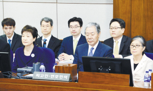 上图:5月23日上午,在韩国首尔中央地方法院,韩国前总统朴槿惠(前排左一)与崔顺实(前排右一)出席庭审。