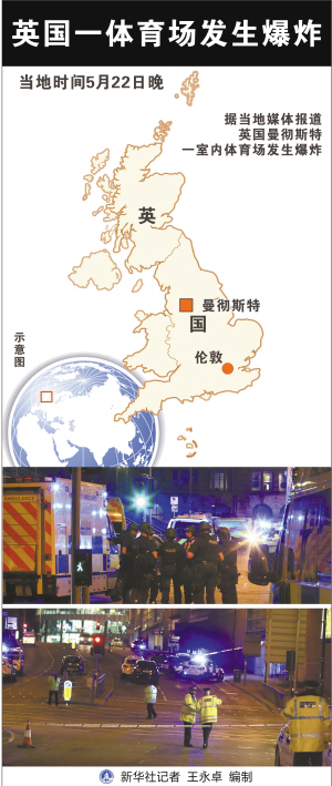 英国伦敦议会大厦恐袭事件仅过去两个月,曼彻斯特又传来爆炸声。当地一室内体育馆22日晚发生爆炸。英国首相特雷莎·梅谴责此次事件,目前英国警方正在按“恐怖袭击”展开调查。