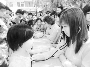 6月1日,商水县舒庄乡卫生院医护人员到杜店小学,为该校400多名留守儿童开展健康体检。图为体检现场。乔连军 摄
