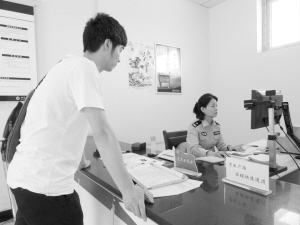 近日,为解决个别考生在高考期间丢失、遗忘身份证而耽误考试等问题,市公安局荷花路分局在户政大厅临时增设“考生户籍快速办理通道”,做到只要群众出具户籍证明信息,一分钟内就能办结相关手续,解决考生燃眉之急。图为6月6日户籍警正在办理业务。