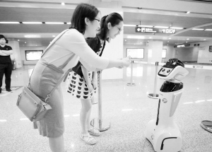 6月7日,在宁波轨道交通1号线樱花公园站,乘客被机器人“小轨”吸引。当日,一款智能服务机器人亮相宁波轨道交通1号线。这款机器人名叫“小轨”,可以为乘客提供票价咨询、首末班车时间表、地铁站卫生间及无障碍电梯位置查询等服务,还能够实现人脸识别并主动与乘客打招呼。新华社发