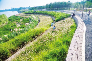 流沙河玉盘落珠位于腾飞路和淮阳路交叉口西北角,设计多个水中生态岛和岸上水泡,小岛和水泡犹如一个个珍珠掉落盘中,打造水中岸上互动的湿地景观;水中布置曝氧喷泉,既净化水体,又能作为观赏水景;设置栈道穿行于小岛与水泡之间,打造参与性强的湿地景观区。