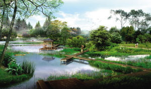 流沙河湿地公园位于流沙河、贾东干渠两条河道交汇处,形成大面积水景,设计打造成为涵养水源的湿地景观区,结合当地老子文化,成为科普教育场地。