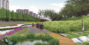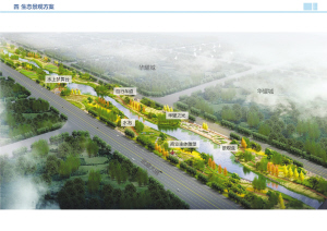 洼冲沟两侧景观范围较窄,在满足河道防洪基础上,在迎水面堤坡及生态浅滩上设置观水眺台、亲水平台、亲水栈道三种形式的赏水设施二十余处。在堤外设置主题广场、休闲小广场、亭廊花架、雕塑小品等展现周口文化底蕴,提供休闲活动场所。同时设置停车场、管理房、公厕等服务设施,满足居民需求。