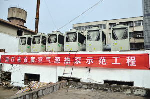 周口易圣热力公司前期设计出由8台25p超低温空气源热泵替代热源,标准工况制热量为70KW,输入功率为21KW,设备总负荷为550KW,设计供暖水温度为55/50℃,该机组在零下25℃仍能强劲制热。