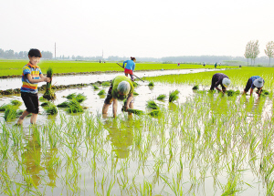 昨日,扶沟县城郊乡谢村农民正在稻田里插秧。据了解,该乡常年种植水稻1万余亩,均为有机、生态保护栽植,生产的水稻质优价高,供不应求,群众收入颇丰。黄金峰 摄