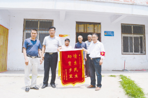 西华县物资行业办公室驻叶埠口乡泥土店村扶贫工作队在实施精准扶贫中,想方设法解困难群众燃眉之急,积极为该村三名贫困学生申请救助款,同时三名工作队员也慷慨解囊为他们捐款,帮助他们筹备学费。图为近日受资助的贫困学生家长代表为工作队赠送锦旗表达谢意。