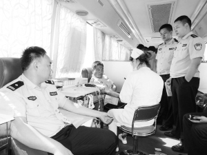 为积极营造人人参与无偿献血的浓厚氛围,7月1日,市公安局七一路分局局长万东伟、文昌分局局长周运杰带领200名党员干警和东新区消防官兵来到市体育中心义务献血现场,开展“庆‘七一’义务献血”活动,现场献血总量达6万多毫升。图为七一分局党员干警正在排队献血。 记者 徐如景 通讯员 毛俊伟 摄