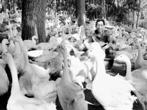 7月13日,在沈丘县周营乡刘集村一处划定的规范化养殖基地,农民张云喜正在林下放养生态肉鹅。近年来,该县利用丰富的林木和水草资源,鼓励农民采取“基地+合作社+农户”的方式,大力发展水产及生态鸭、鹅养殖业。谢辛凌 摄
