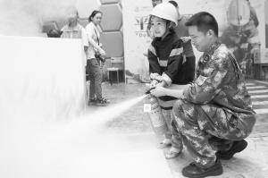 7月16日,来自杭州市江干区消防大队七堡消防中队的消防员在教授一位小朋友使用灭火器。
