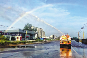 昨日,骄阳似火,一辆洒水车迎着彩虹在市区太清路上作业。连日来,市公路局路产路权管理处和应急抢险中心施工人员来来往往、忙碌穿梭在市区施工路段,他们紧抓公路扬尘防治不放松,采取机械与人工相结合的方式彻底清扫保洁道路,为广大市民提供一个“畅、洁、绿、美”的行车环境。