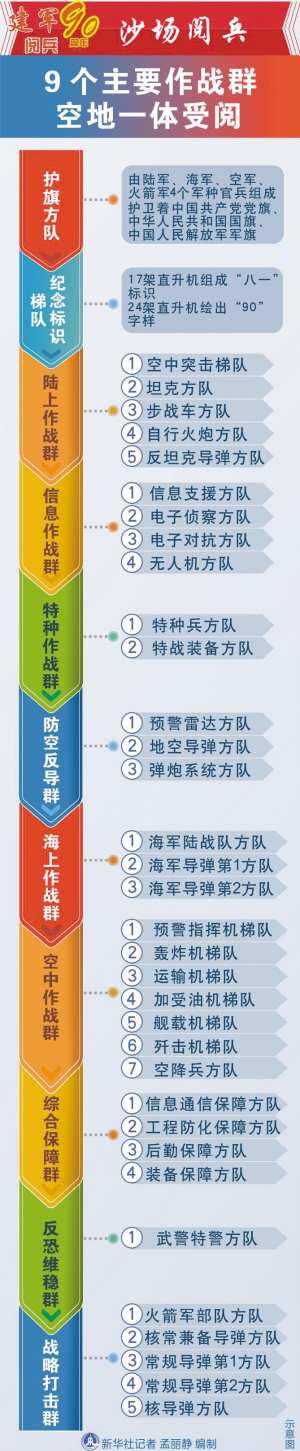 陆上作战、信息作战、特种作战、防空反导、海上作战、空中作战、综合保障、反恐维稳、战略打击共9个主要作战群依次接受检阅。