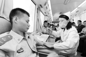 7月31日,消防战士在献血车上献血。当日,安徽省淮北市公安消防支队相山大队三堤口中队的官兵在营地参加无偿献血活动,以特殊的方式迎接“八一”建军节。新华社发