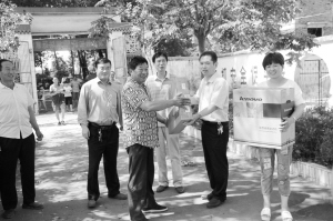 近日,扶沟县检察院检察长苏宏锦带领班子成员和帮扶干警到固城乡大王村开展入户调查走访活动,详细了解该村小学的基础建设、师资力量及存在的困难和问题。图为苏宏锦向村小学赠送购买的电脑。