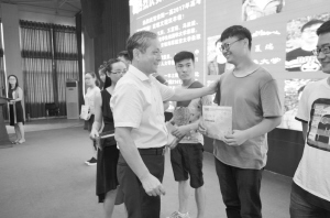 7月25日上午,淮阳一高举行清华大学录取通知书暨励志助学金发放仪式。仪式上,淮阳一高校长王业生为该校身残志坚的优秀学子王复印颁发了1万元助学金。记者 刘华志 摄