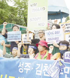 当日, 在位于首尔的韩国国防部门前,百余名韩国民众振臂呐喊。来自“萨德”系统在韩部署地星州郡的居民以及各地和平人士举行集会,反对继续部署“萨德”剩余装备。 新华社发