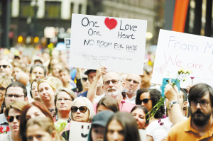 数百名芝加哥市民13日聚集在市中心的联邦广场,为夏洛茨维尔市暴力事件受害者举行纪念活动。美国弗吉尼亚州夏洛茨维尔市12日在大规模集会期间发生暴力事件,导致3人死亡、30多人受伤。 新华社发