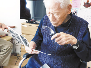 ↑6月10日,在日本兵库县明石市,前田光繁看战时在中国的老照片。新华社发