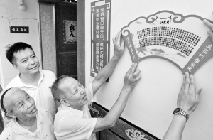 8月16日,福清市江兜村村民王利贵(右前)在家门口张贴新立的村规民约。近年来,福建省福清市江兜村在创建“文明村镇”过程中,注重家风、民风建设,结合中华传统文化,把优秀的名言警句和家规家训宣传牌张贴在全村750户村民家中,营造风清气正的良好社会氛围。新华社记者 张国俊 摄