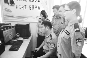 昨日,市公安局交通管理支队五大队组织民警观看《法治中国》专题片。近日,六集政论专题片《法治中国》在中央电视台播出后,迅速在市公安机关及广大公安民警中间引起了强烈反响。全体民警纷纷表示,坚决执行各级党委、政府和上级公安机关各项部署,勇于担当,奉法前行,努力推进法治周口建设,为全市经济社会发展提供有力的法制保障。 郁发顺 摄