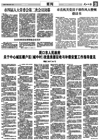 为规范周口市中心城区棚户区(城中村)改造项目国有土地和集体土地上房屋征收补偿安置行为,切实维护被征收人的合法权益,积极稳妥推进棚户区(城中村)改造,打造生态宜居的城市环境,造福人民群众,现对补偿安置工作提出如下意见。