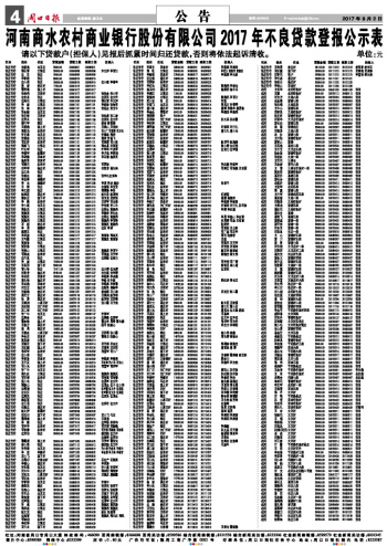 河南商水农村商业银行股份有限公司2017年不良贷款登报公示表