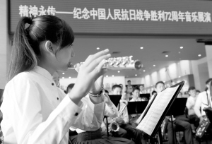 9月3日,北京市八一学校金帆管乐团的同学们在演出。当日是中国人民抗日战争胜利72周年纪念日。北京中国人民抗日战争纪念馆举行“精神永传——纪念中国人民抗日战争胜利72周年音乐展演”主题活动。受邀参加演出的北京市八一学校金帆管乐团和北京新四军老战士合唱团为观众演奏了众多优秀抗战歌曲。新华社记者 罗晓光 摄
