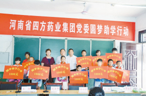 8月24日上午,河南四方药业集团响应“党旗领航促脱贫”活动号召,组织员工来到城北办事处邵火庙行政村开展扶贫圆梦助学活动,资助贫困学生11名,共发放助学金13000元和价值2000多元的学习用品。 宋学刚 摄