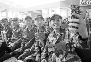 9月10日,新兵在北京南站候车区用手机拍照留念。