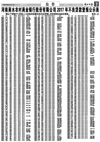 河南商水农村商业银行股份有限公司2017年不良贷款登报公示表