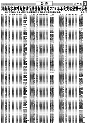 河南商水农村商业银行股份有限公司2017年不良贷款登报公示表