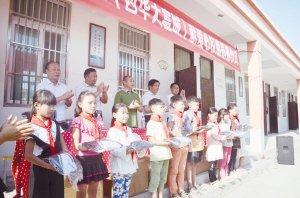 9月13日下午,爱心企业家周口凯盛实业有限公司负责人方凯为西华县田口乡大庞村小学、后王村小学和清河驿乡高古洞村小学捐赠校服共计600余套。图为捐赠仪式现场。记者 张猛 摄