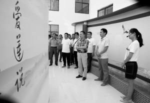 扶沟县纪委在创建省级园林单位和省级文明单位的同时,利用办公楼前庭院和办公楼内的廊道空间,把廉洁思想融入花语之中,倾心打造对外开放的“花语廉心”廉政文化教育基地。图为日前该县水利局机关干部在“花语廉心”廉政文化教育基地参观学习。