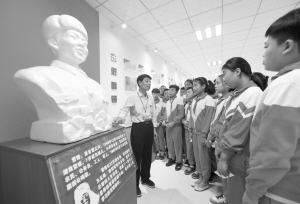 9月23日,河北省唐山市古冶区雷锋精神纪念馆义务讲解员段思序(左一)为前来参观的小学生们讲述雷锋事迹。