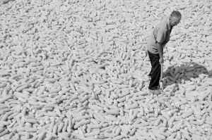 9月22日,唐山市丰润区张庄村一位村民在晾晒收获的玉米。