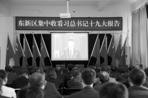本报讯(记者 张劲松 文/图)10月18日上午,中国共产党第十九次全国代表大会在北京开幕。当日,东新区党工委书记闫立超、管委会主任张建党及全体机关干部通过收看会议实况直播,认真聆听习近平同志所作的工作报告,第一时间了解会议精神。