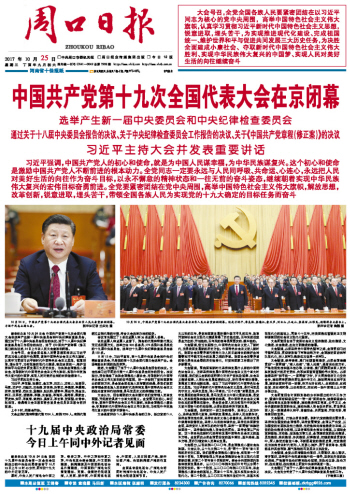 大会号召,全党全国各族人民要紧密团结在以习近平同志为核心的党中央周围,高举中国特色社会主义伟大旗帜,认真学习贯彻习近平新时代中国特色社会主义思想,锐意进取,埋头苦干,为实现推进现代化建设、完成祖国统一、维护世界和平与促进共同发展三大历史任务,为决胜全面建成小康社会、夺取新时代中国特色社会主义伟大胜利、实现中华民族伟大复兴的中国梦、实现人民b@