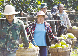 在广西融水苗族自治县国营贝江河林场的糯米柚基地里,工人挑着刚刚采收的糯米柚,准备装车(10月31日摄)。