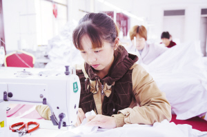 11月6日,高寺镇张老家行政村精准扶贫服装厂内,工人正在赶制标志服。高寺镇为建档立卡贫困户办起了就业扶贫服装厂、电子厂和木器加工厂等,并把这些工厂建到了村民家门口。张永久 摄