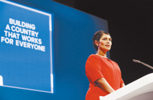 这是10月3日,在英国曼彻斯特,普丽蒂·帕特尔在保守党年度大会上演讲的资料照片。新华社发