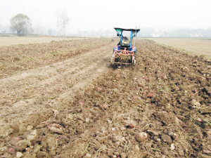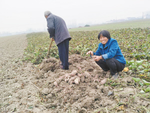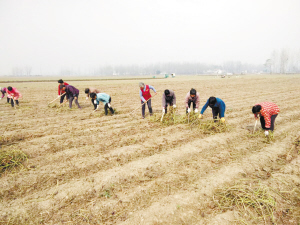 合作社社员们忙于割秧,为机械化翻薯割除障碍。 11月14日,沈丘县李老庄乡王白庙村,天宝专业种植合作社订单种植的800多亩红薯喜迎丰收,亩产高达8000斤,亩均纯收益2400元。 (记者 韦伟 通讯员 杨健 文/图。)